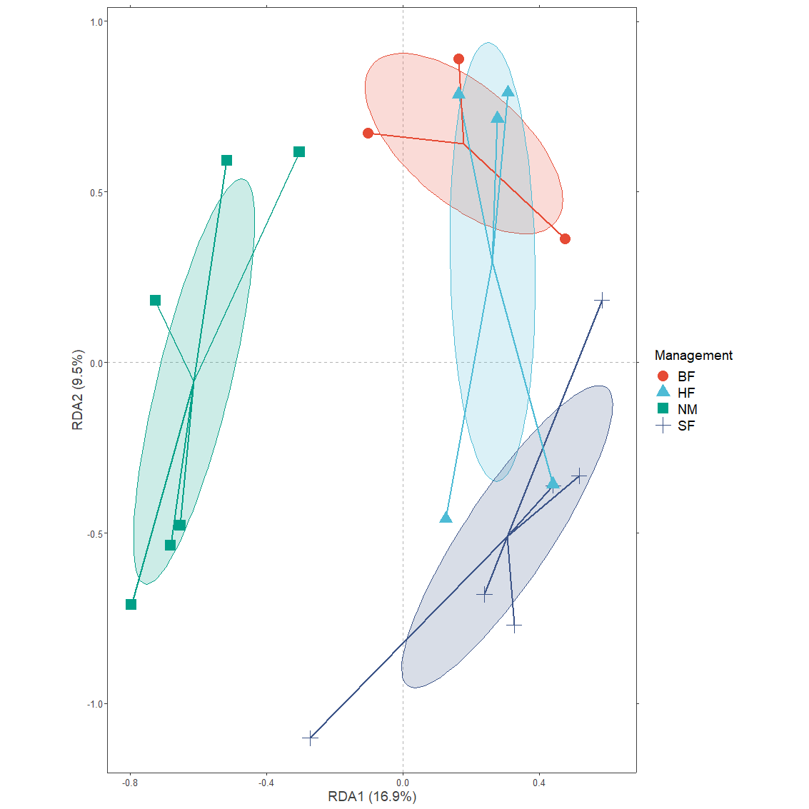 Ordination.model1 <- rda(dune.Hellinger ~ Management,