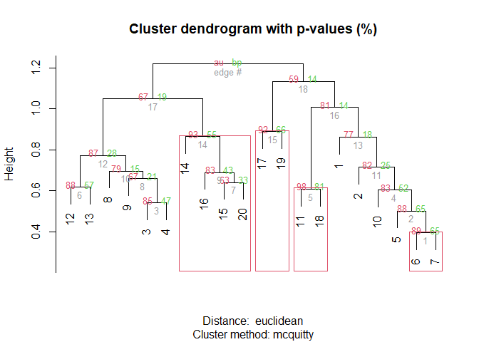 pvlong <- pvclust.long(dune.pv, cl.data1)With a similar methodology as available in ordicluster, higher clustering levels in the hierarchy can be removed via variable prune available from the results for nodes and branches.
