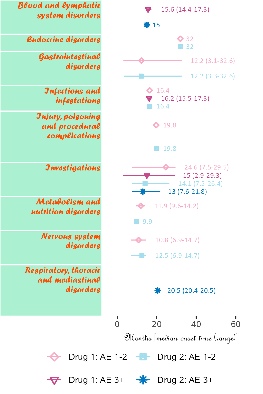 The next plot summarizes timeline by AE category. Fonts, colours, symbols, column widths (character length) and time unit are customized.