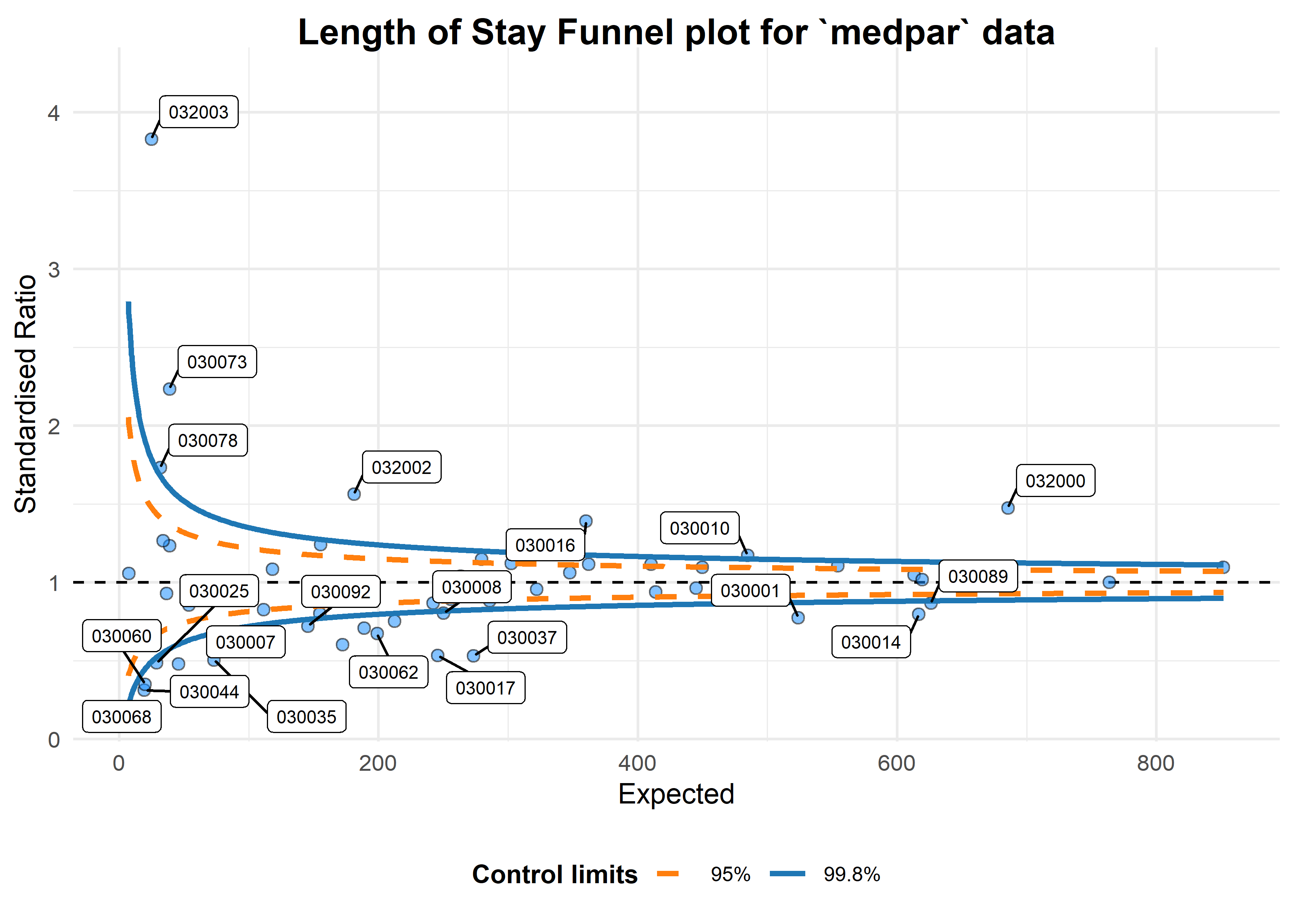 title = 'Length of Stay Funnel plot for `medpar` data', data_type = "SR", limit=  99,