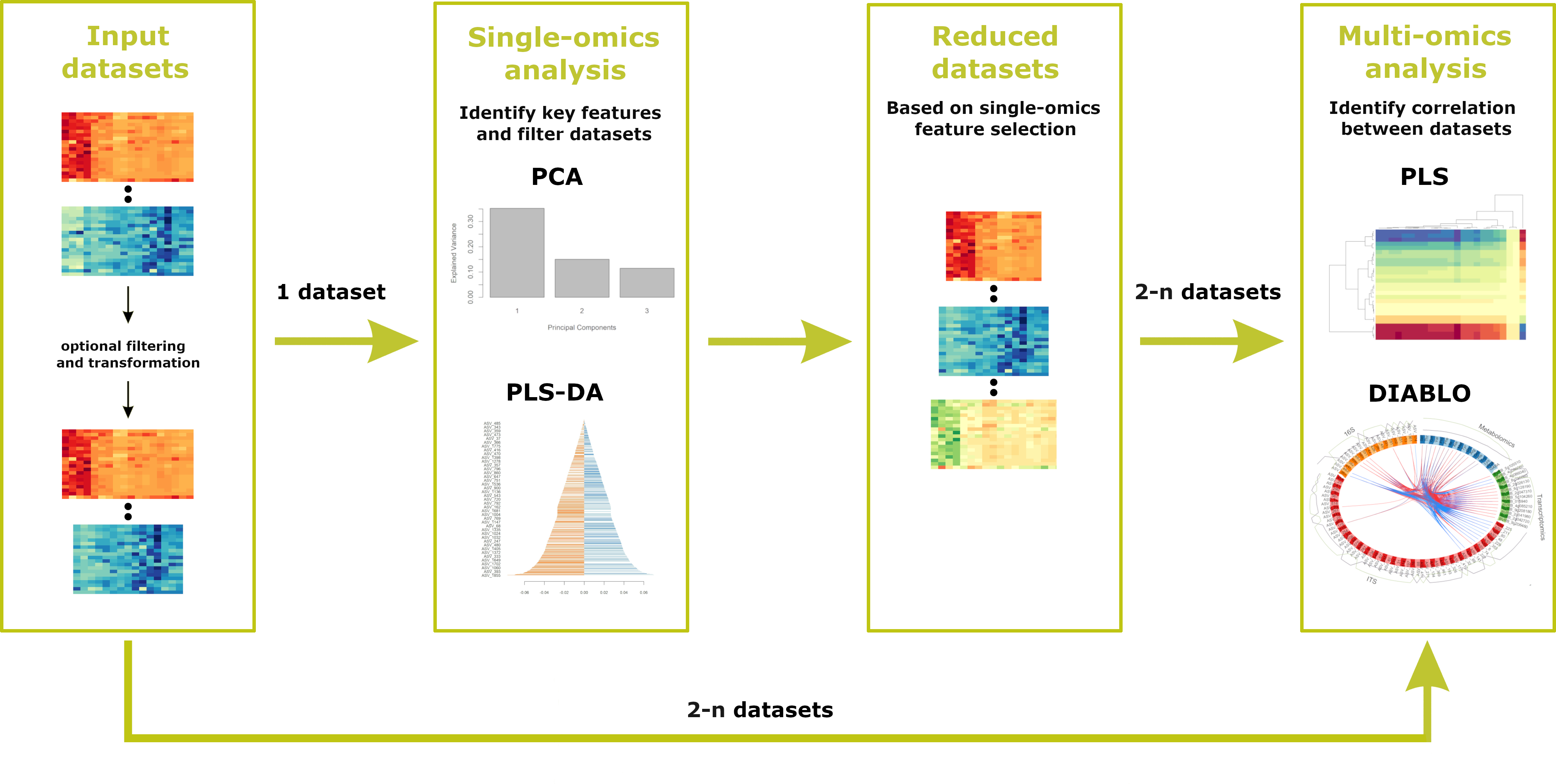 Holomics is primarily built on the R package mixOmics, which offers numerous algorithms for the integrative analysis of omics datasets. From this repertoire, the single-omics algorithms “Principal Component Analysis” (PCA) and “Partial Least Squares Discriminant Analysis” (PLS-DA), the pairwise-omics analysis “sparse Partial Least Squares” (sPLS) and the multi-omics framework DIABLO (“Data Integration Analysis for Biomarker discovery using Latent variable approaches for Omics studies”) have been implemented in Holomics.