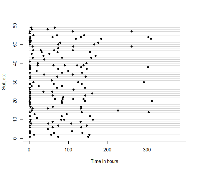 xlab.abacus="Time in hours",pch=16,col.abacus=gray(0.8))