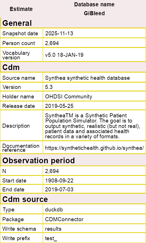 tableOmopSnapshot(result = snapshot, type = "flextable")