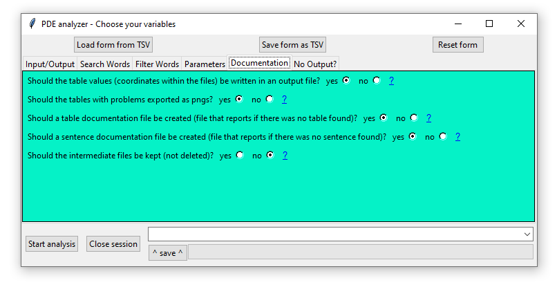 1. Choose what to extract: The PDE analyzer has 2 main functions A] PDF2TXT (extract sentences from pdf) and B] PDF2TABLE (table of PDF to excel file) which can be combined or executed separately. Each function can be combined with filters and search words. A file with the sentences carrying the search words will have the name format: [search words]txt+-[context][PDF file name] in the corresponding subfolder. Tables will be named: [PDF file name][number of table][table heading].