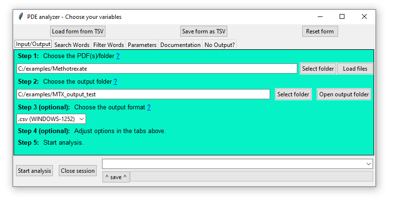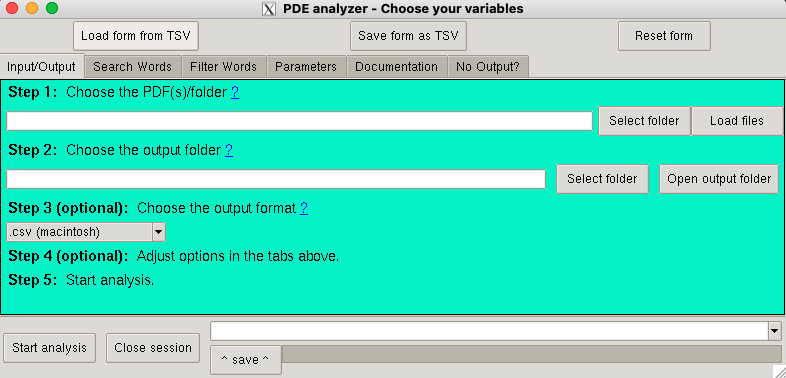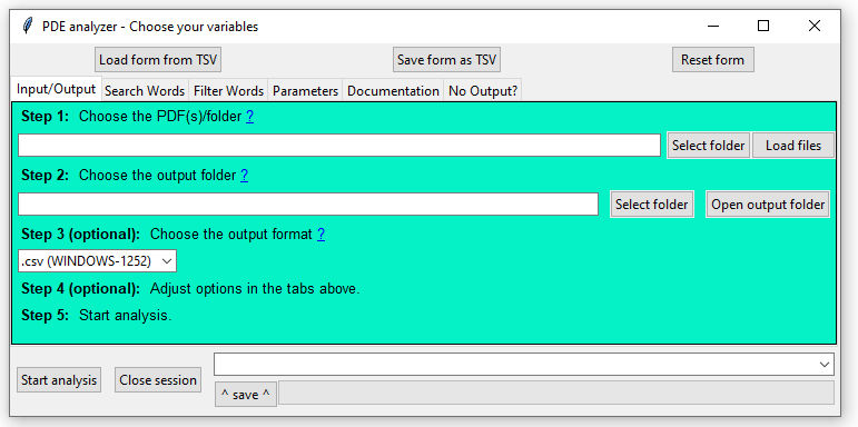 NOTE: Choose an empty folder or create a new one as the output directory, since analyses create at least a number of files equal to the number of PDF files analyzed.
