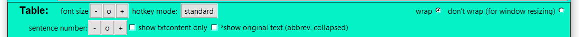 1. Sentence number: When choosing a analysis file with txt+-1 or higher the number of senten displayed can be decreased (-), increased (+), or reset (o). When changing this setting, the sentences with the search word will always be displayed.