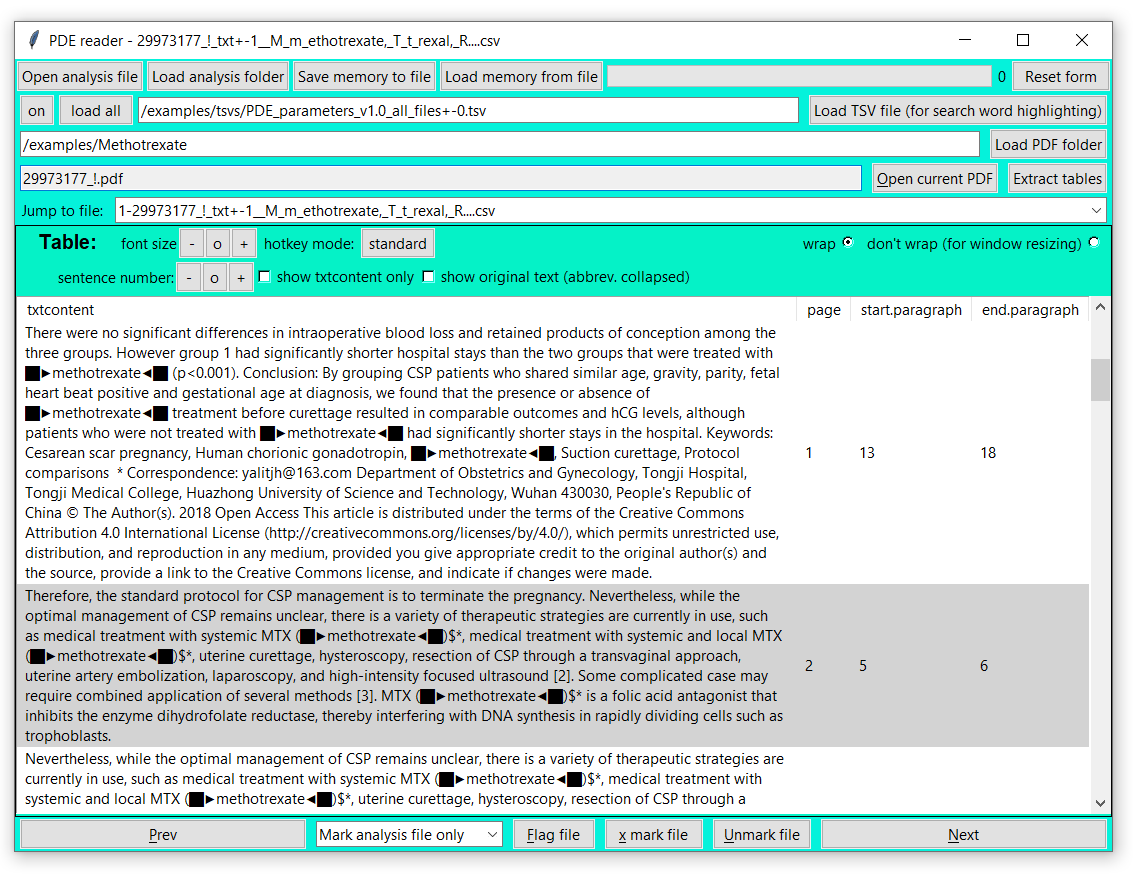 1. Load PDF folder: To enable the Open current pdf as well as Extract tables button load the PDF folder into the reader, i.e. examples/Methotrexate.
