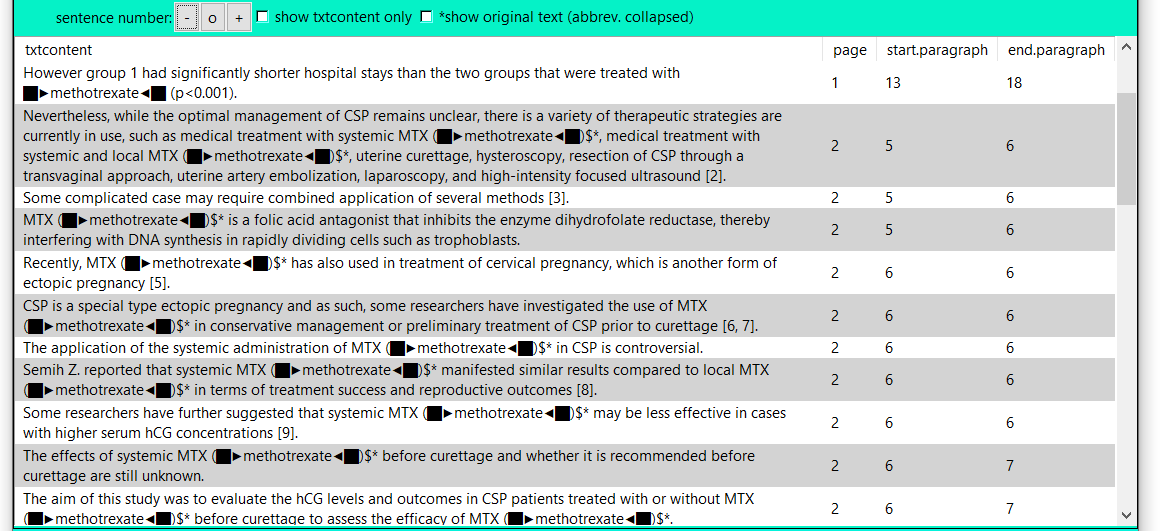 3. Load either a sentence analysis file such as 31083238_!_txt+-0__M_m_ethotrexate,_T_t_rexal,_R....csv or the whole folder folder with such files, e.g., examples/MTX_output.