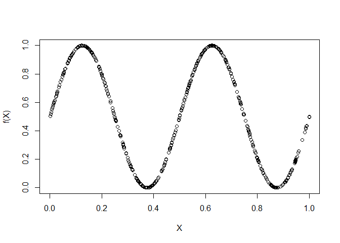 X <- cbind(x1, 0.5*sin(4*pi*x1)+0.5)
