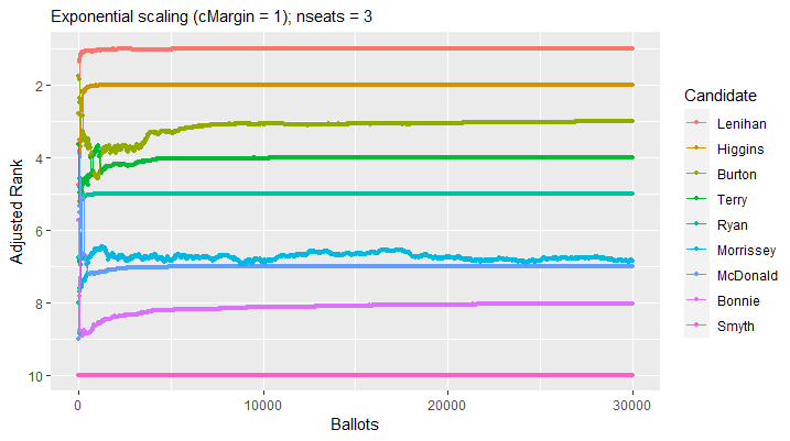 In the sample testDeletions plot above, Morrissey’s adjusted rank is visually very close to McDonald’s adjusted rank when most of the ballots have been counted. This suggests to us that their relative standing in this election is sensitive to small variations in voter behaviour.