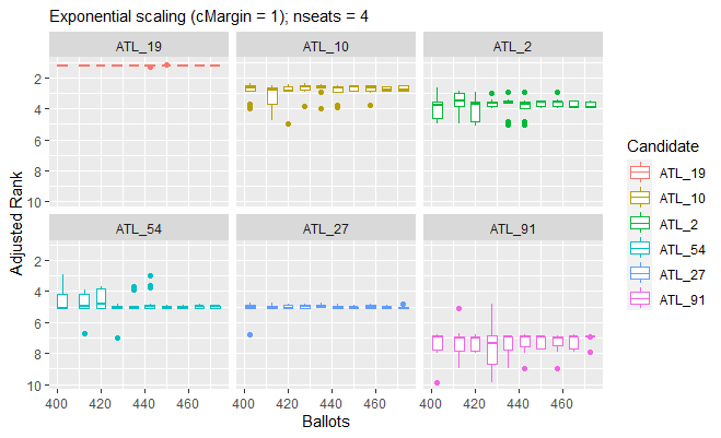 In the plots above, the “adjusted rank” of a candidate is their ranking \(r\) plus their scaled margin of victory. Following the usual convention, the most-popular candidate is at rank 1. Accordingly, we invert the \(y\)-axis so that the rank-1 candidate is visually dominant. Our default scaling of a margin of victory \(m\) is \(e^{-cm/\sqrt{n}}\). This exponential scaling makes it possible to see small differences in vote-counts in the small margins of victory which affect the safety of an election result. Note that a very small margin of victory adds almost a whole unit to the candidate’s rank. We introduce the scaling factor \(c/\sqrt{n}\) into the exponent as a rough-cut estimate of the standard deviation of the standard deviation of a victory margin in an election with \(n\) ballots. A candidate whose margin of victory is a multiple of \(\sqrt{n}\) thus has a very small adjustment to their rank in our plots. Our margin-scaling parameter \(c\) has the default value of 1, and may be adjusted using the parameter cMargin of plot.SafeVote.