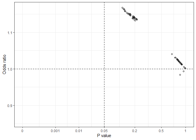 From this all_plot graph, we can see that all estimated odds ratio values fell in the left-side two quarters, with either a positive or a negative association but p values in all possible models were greater than 0.05.