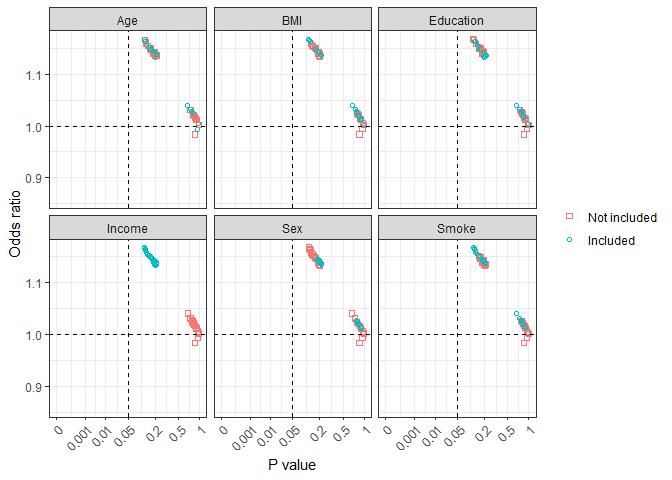 all_plot2 graph shows effect estimates with a specific variable being included or not included in the model. This can be helpful in combination with biological background knowledge to understand potential confounding effects, uncertainly of the effect estimates, and inappropriate inclusion of some variables.