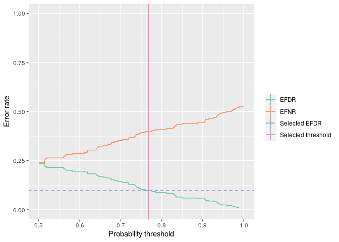 #> Optimal threshold: 0.768 EFDR: 0.0985 EFNR: 0.399