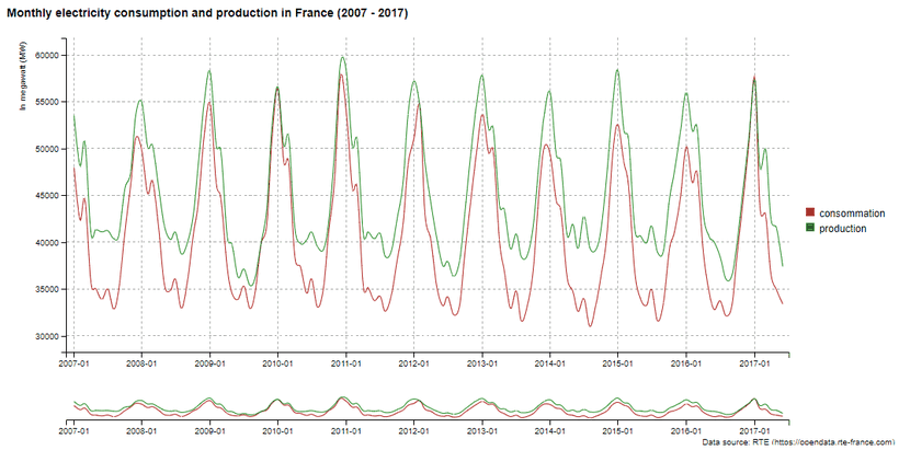 bb_labs(title = "Monthly electricity consumption and production in France (2007 - 2017)",