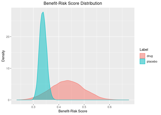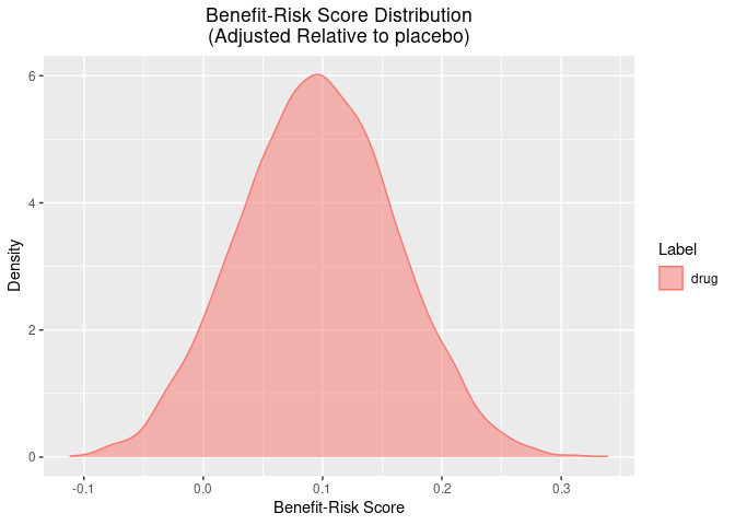 We can also calculate the posterior probability of certain scores. For instance, we can calculate the probability that the difference in benefit-risk scores between the treatment and placebo arms is greater than zero (i.e. the treatment arm is better).