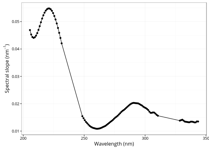 The cdom_spectral_curve() function generates the spectral curve using the slope of the linear regression between the natural log absorption spectrum and wavelengths over a sliding window of 21 nm interval (default) at 1 nm resolution. See Loiselle et al. (2009) for detailed information.