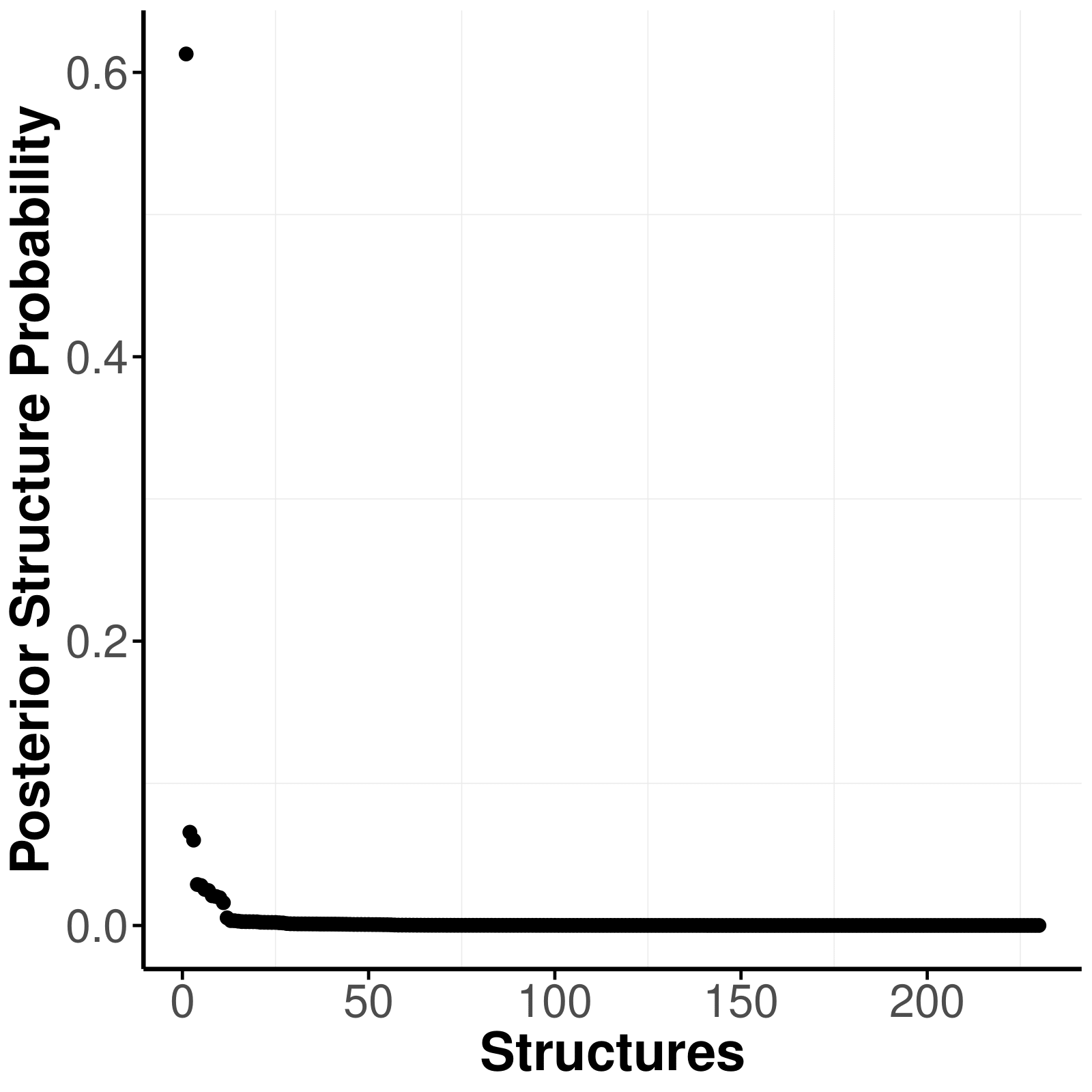The structure uncertainty can be assessed with the posterior structure probability plot and the posterior complexity plot. The posterior structure probability plot shows the posterior probabilities of the visited structures, sorted from the most to the least probable. Each dot represents one structure. The more structures with similar posterior probability, the more uncertain the true structure. If one structure dominates the posterior structure probability, we can be relatively certain about the true structure.