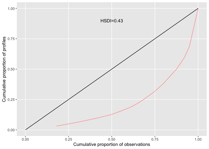 #> AD 1.09 1.58 0.69The Health State Density Curve (HSDC) was introduced by Zamora et al in 2018 and provides a graphical way to depict the distribution of EQ-5D profiles. The cumulative frequency of health profiles ranked from most to least frequent is plotted against the cumulative proportion of the distinct health profiles (red line) and can be compared a uniform distribution representing total equality (black line). The Health State Density Index (HSDI) is based on the area formed by the diagonal line representing total equality and the line of the HSDC. The HSDI has a value between 0 and 1 where a value of 0 represents total inequality and 1 total equality.