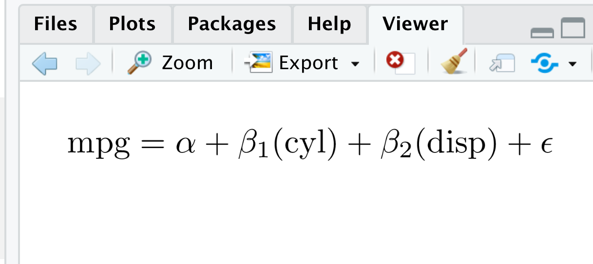 #> \operatorname{mpg} = \alpha + \beta_{1}(\operatorname{cyl}) + \beta_{2}(\operatorname{disp}) + \epsilon