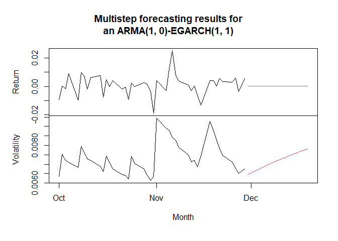 As a further extension, dual-models with autoregressive moving-average (ARMA) model or fractionally integrated ARMA (FARIMA / ARFIMA) model in the conditional mean simultaneously with error process from the EGARCH family can be defined and estimated. For this purpose, the mean_spec() function must be utilized in addition to the previous steps.