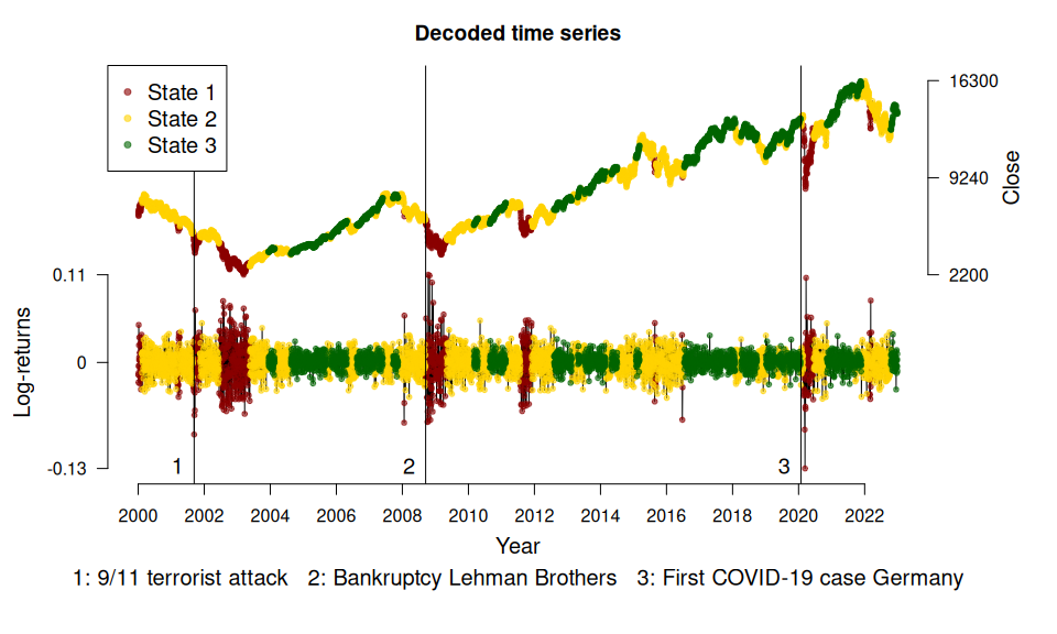 We fit a 3-state HMM with state-dependent t-distributions to the DAX log-returns from 2000 to 2022. The states can be interpreted as proxies for bearish (green below) and bullish markets (red) and an “in-between” market state (yellow).