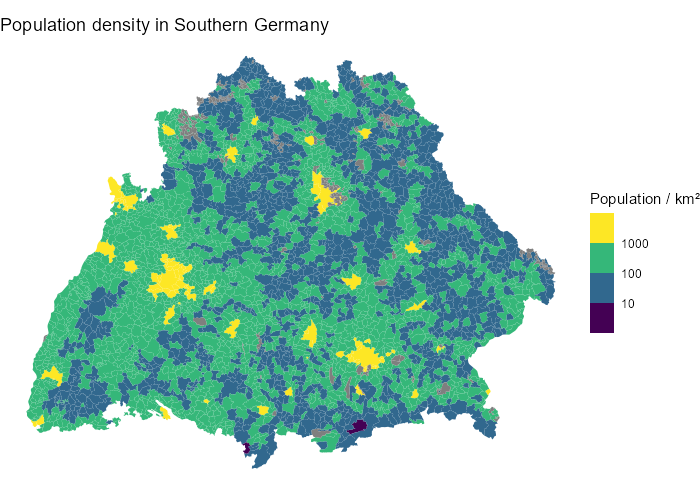 scale_fill_viridis_b("Population / km²", transform = "log10") +