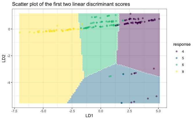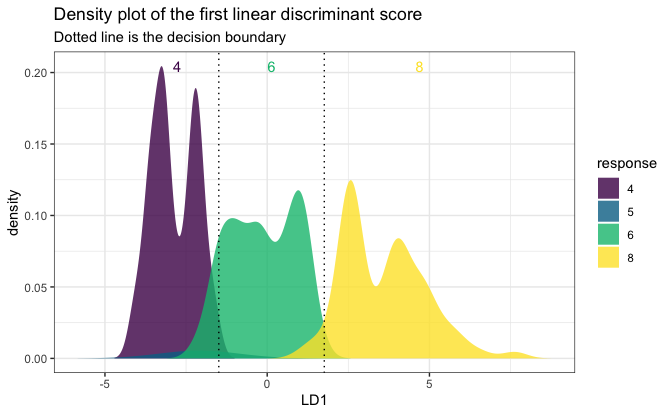 response <- mpg[, 5] # we try to predict "cyl" (number of cylinders)Build a ULDA model with all variables: