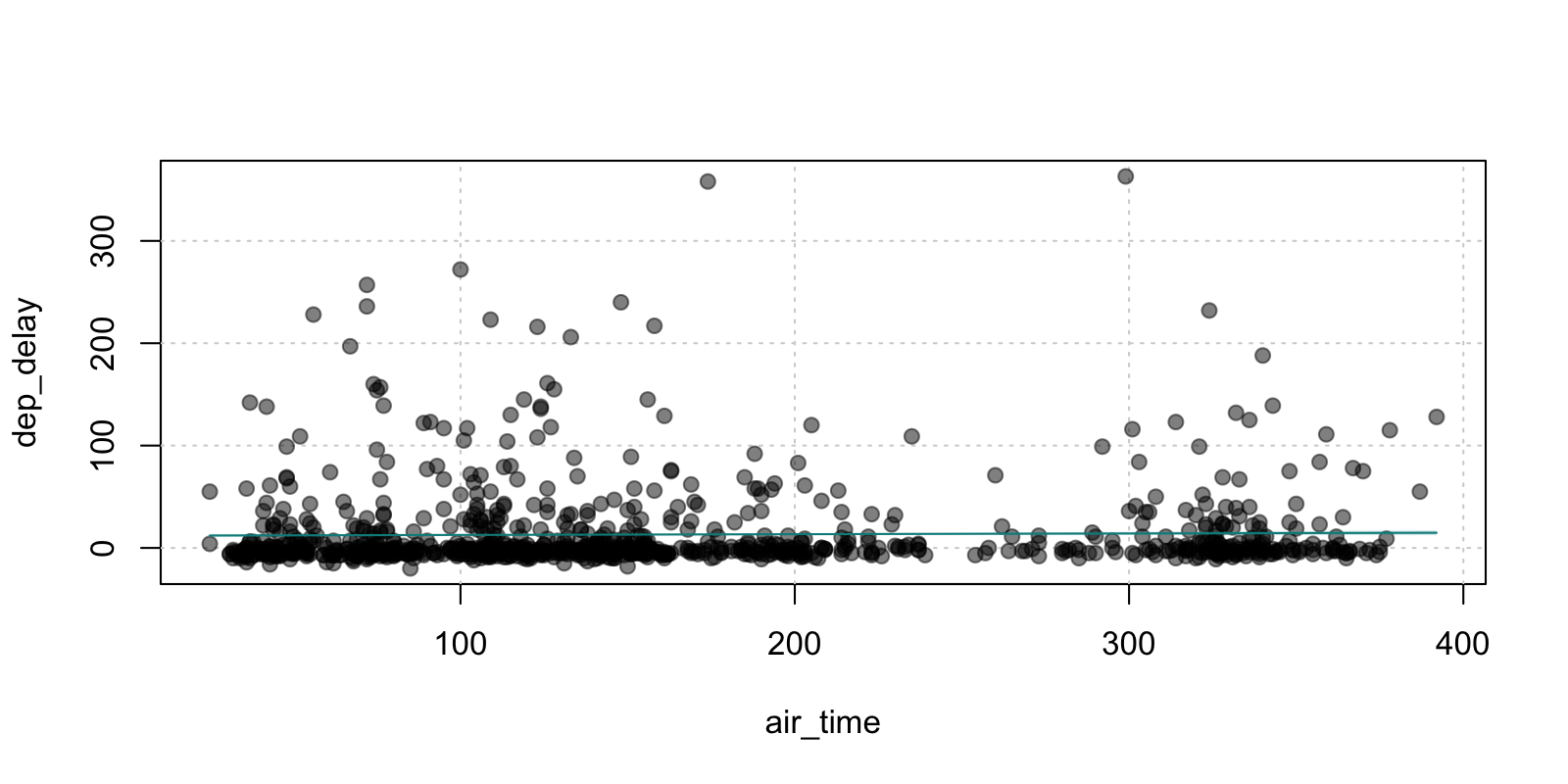 sample <- flights[sample(.N, 10000)]# Without covariates = scatterplot