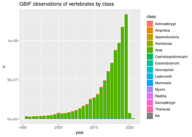 ggtitle("GBIF observations of vertebrates by class")