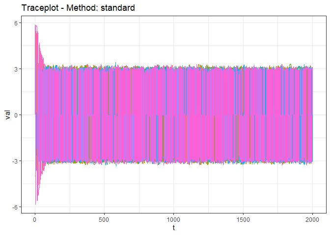 We demonstrate the usage of genMCMCDiag in this simple scenario, using the included simulated MCMC results uniMCMCResults. The output of genDiagnostic is a traceplot and tables containing the ESS and PSRF results. The method is set to ‘standard’ here as we don’t want to transform the data prior to running the diagnostics, as it is already univariate.
