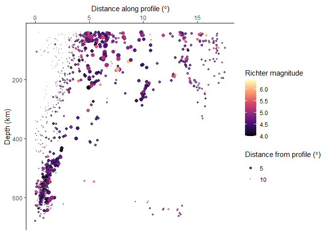 labs(x = bquote("Distance along profile (" * degree * ")"), y = "Depth (km)") +