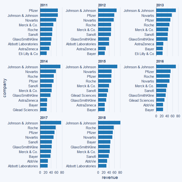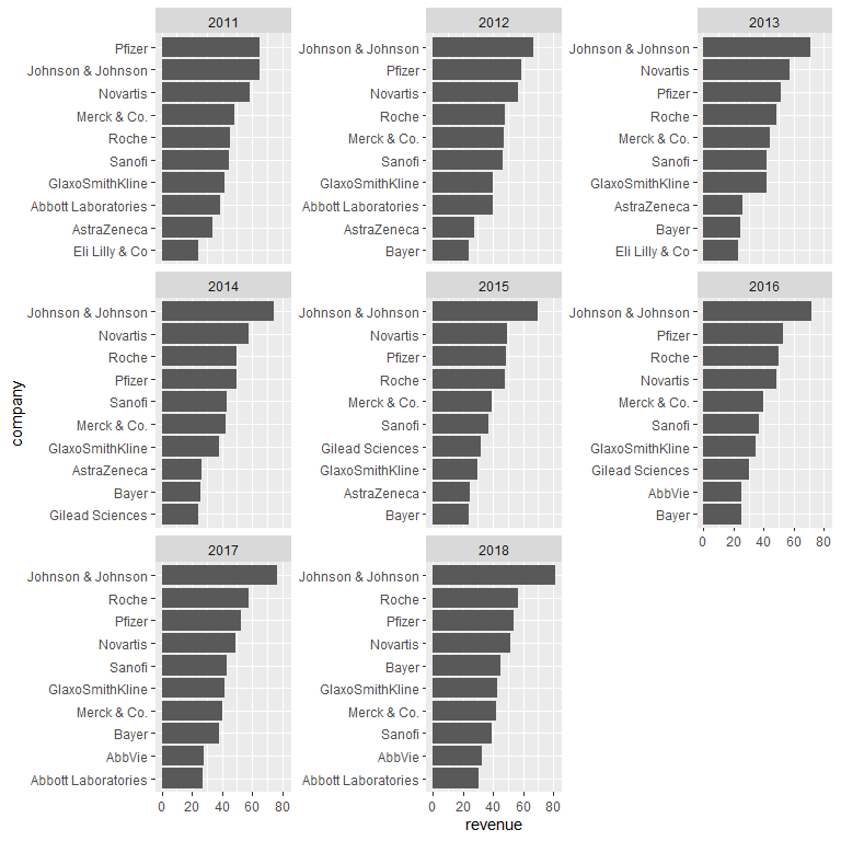 bar_chart(biomedicalrevenue, company, revenue, facet = year, top_n = 10)