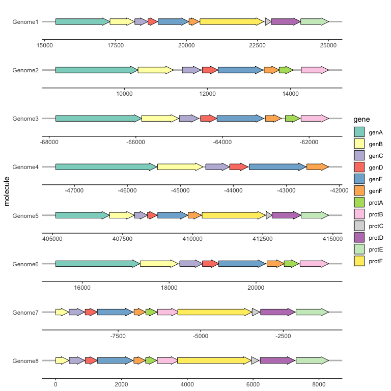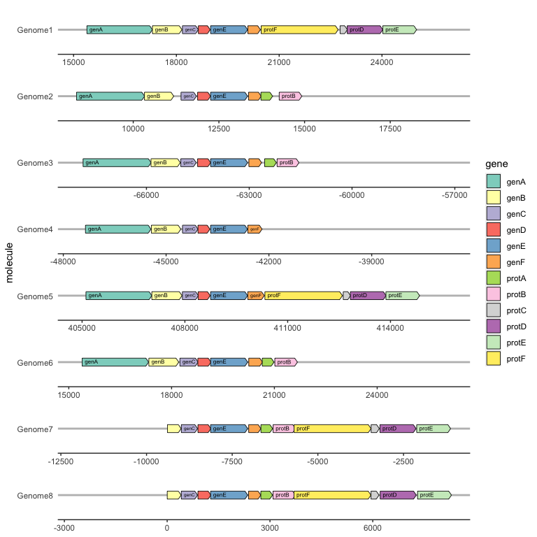 aes(xmin = start, xmax = end, y = molecule, fill = gene, label = gene)