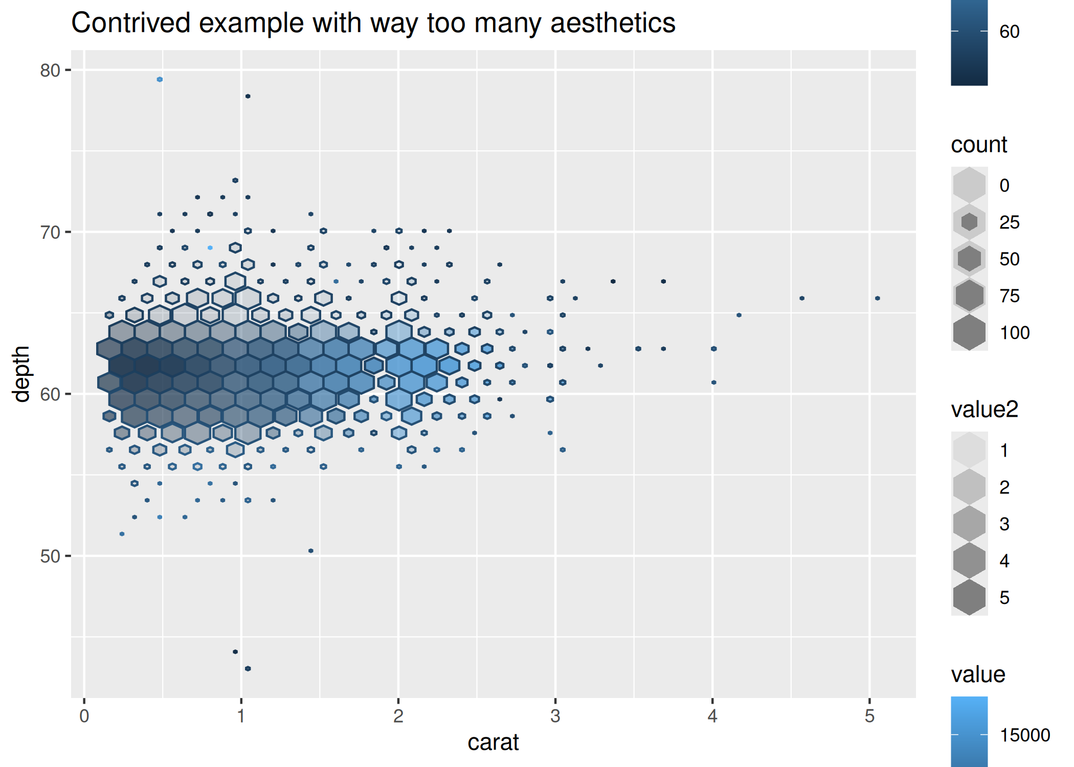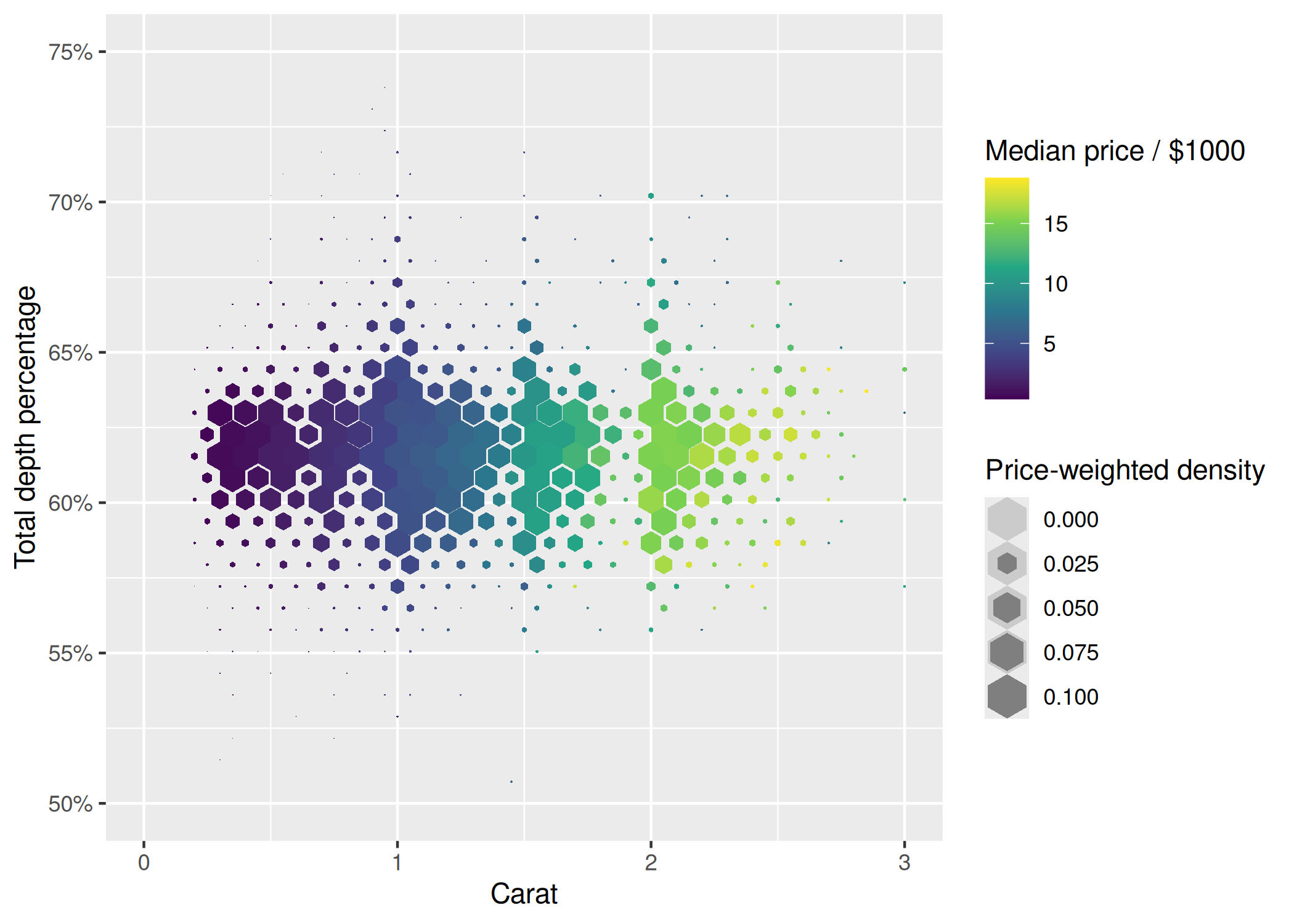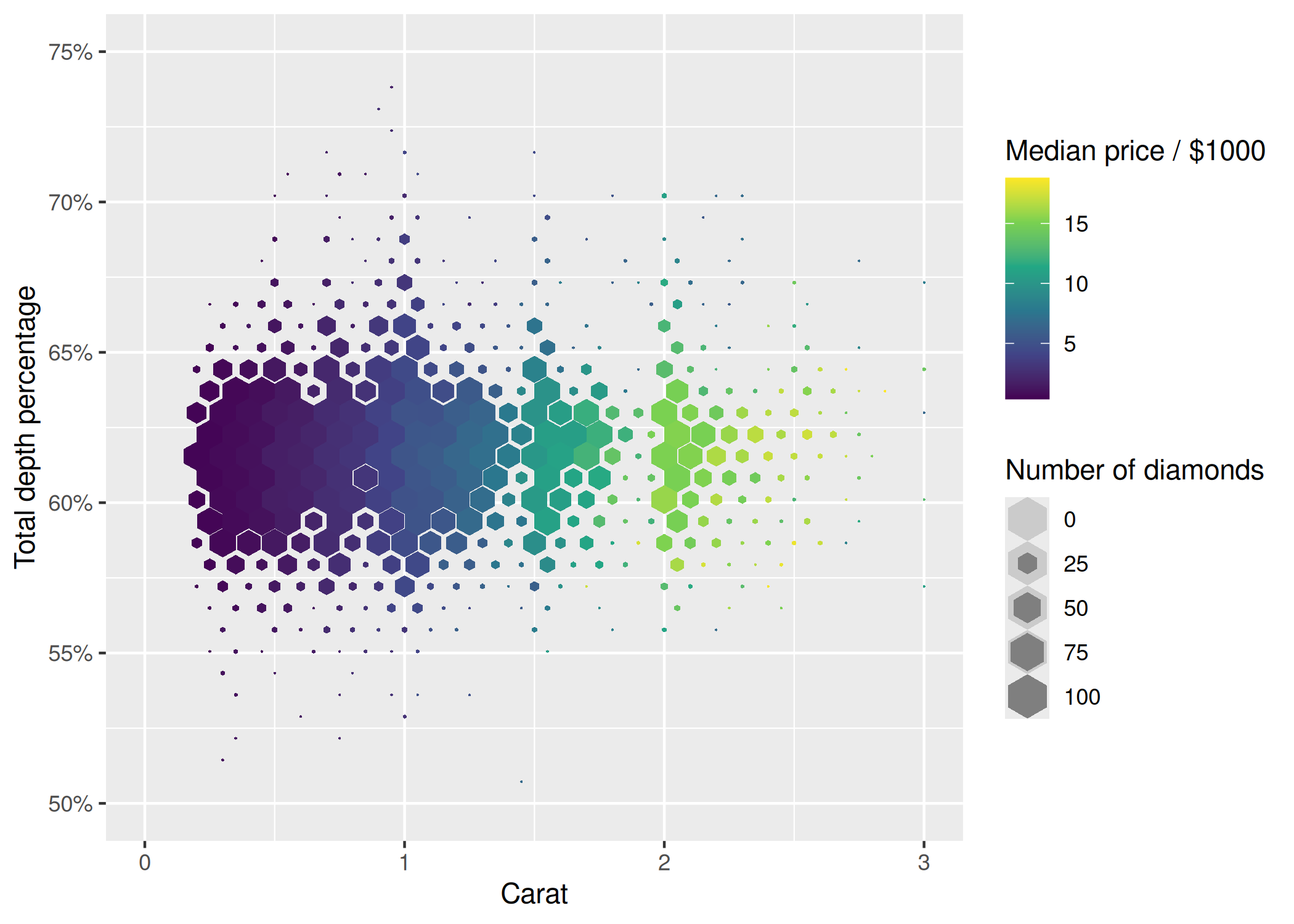 p <- ggplot(diamonds, aes(carat, depth, z = price)) +