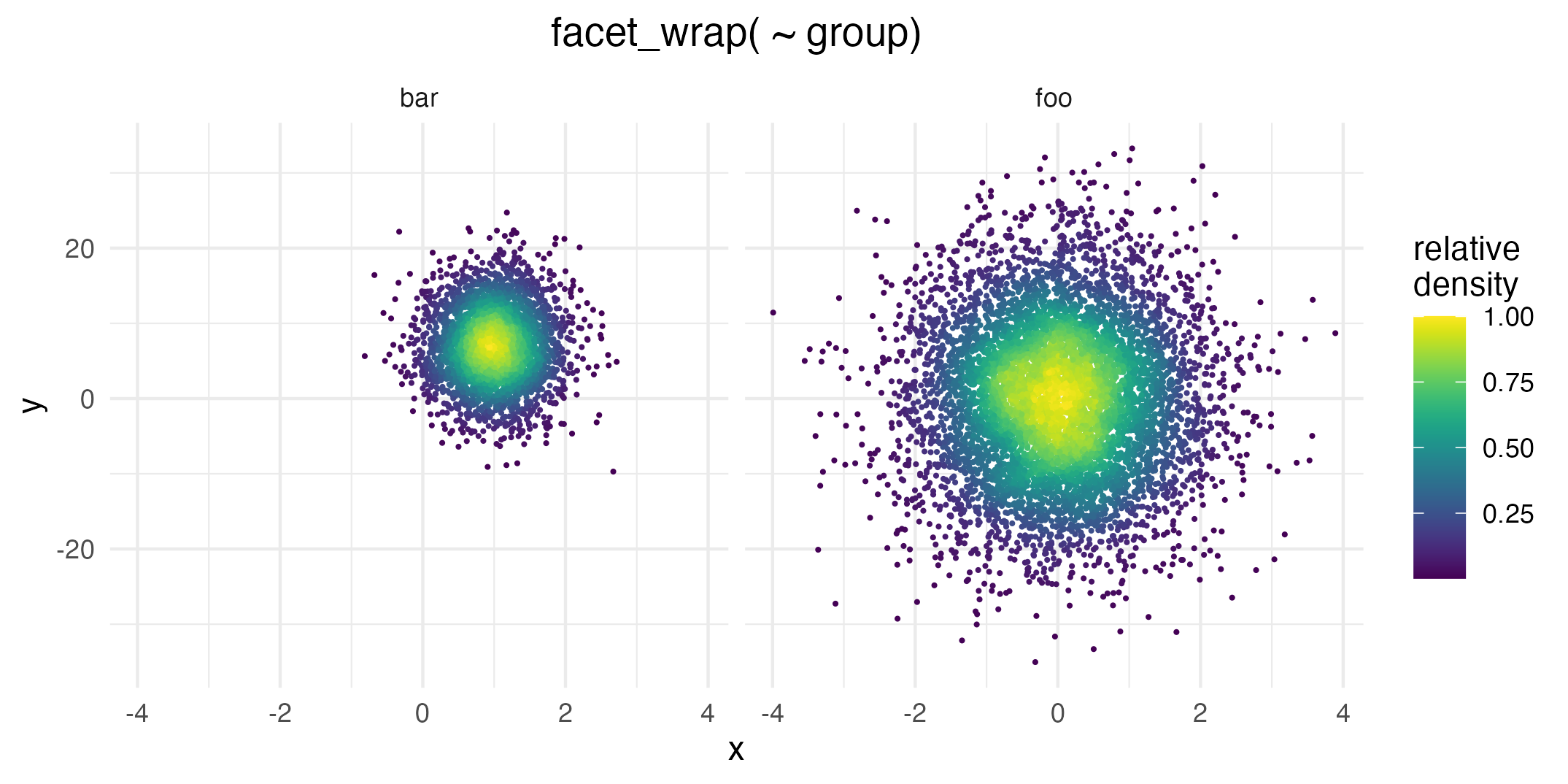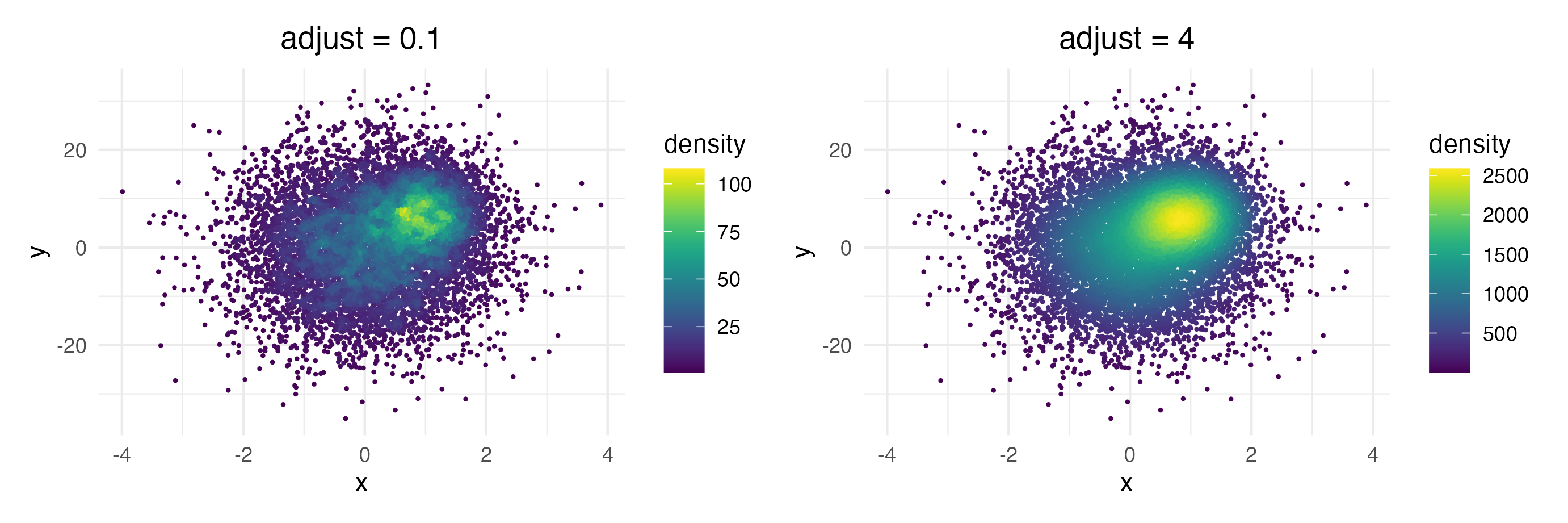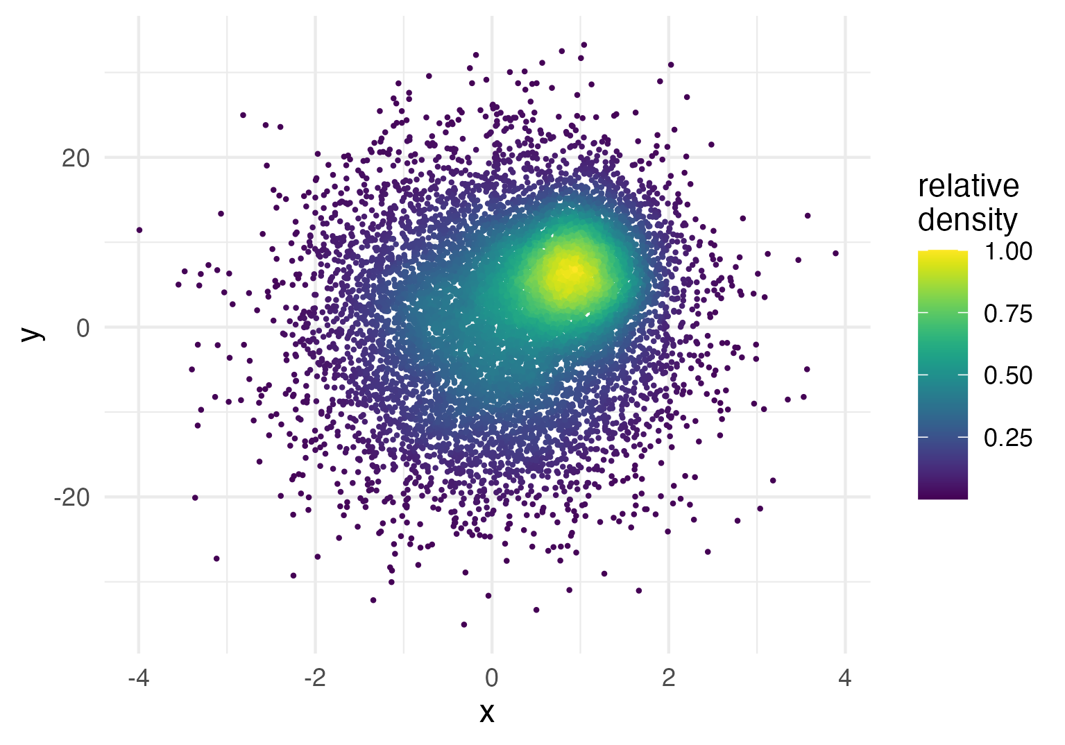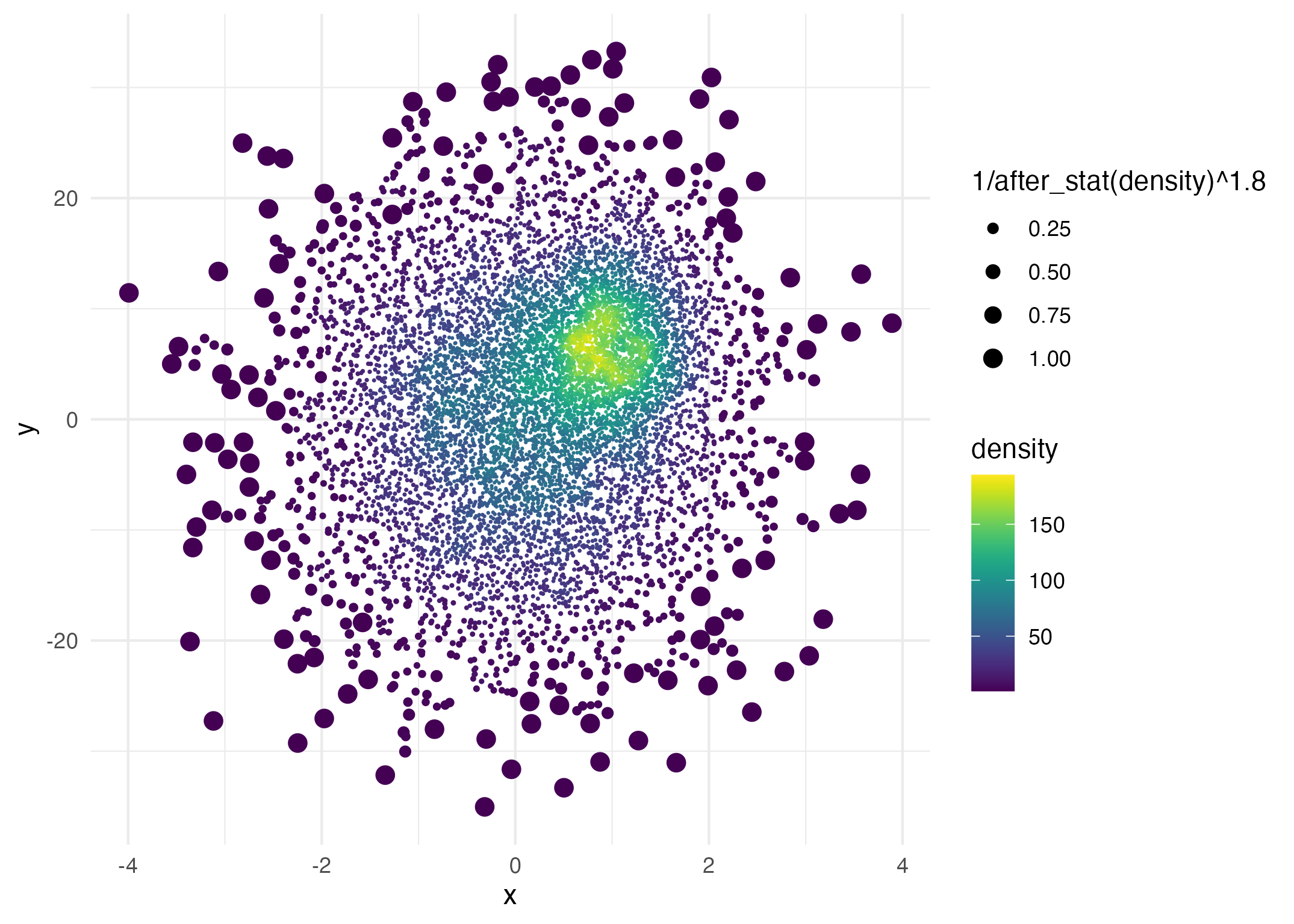 aes(x = x, y = y, size = after_stat(1 / density ^ 1.8))) +