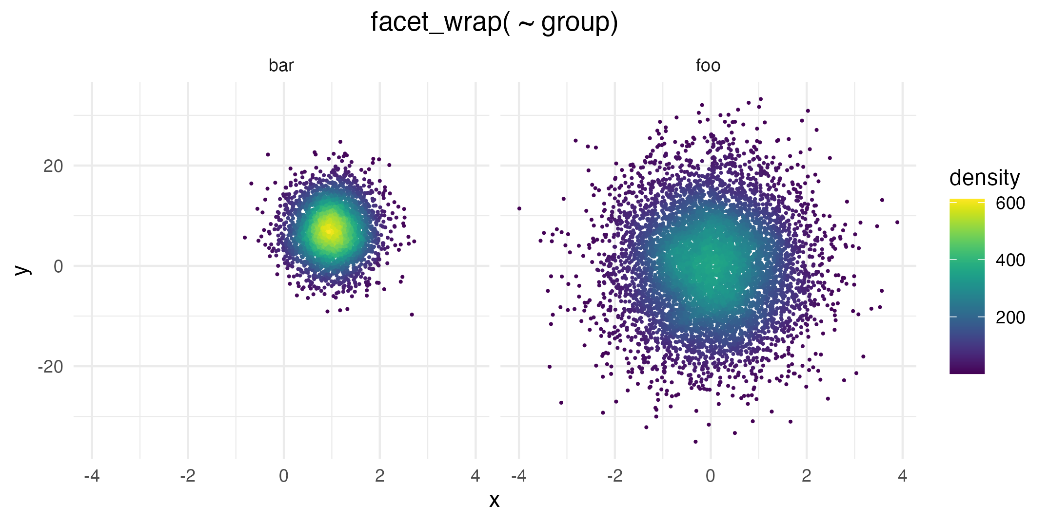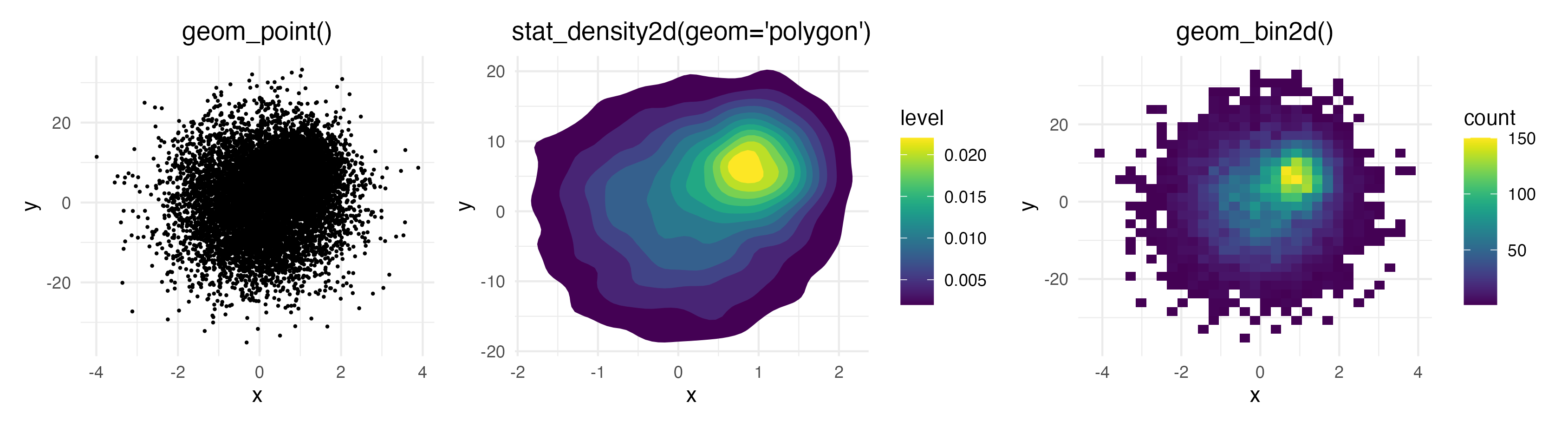 devtools::install_github("LKremer/ggpointdensity")There are several ways to visualize data points on a 2D coordinate