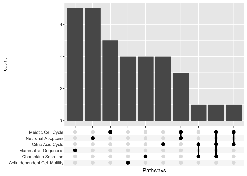 Imagine we measured for a set of genes if they are a member of certain pathway. A gene can be a member of multiple pathways and we want to see which pathways have a large overlap. Unfortunately, we didn’t record the data in a tidy format but as a simple matrix.