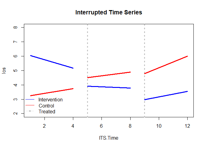 We can also perform an ITS on binary outcomes like death within 30-days. We will examine an intervention and control group at months 5 and 9, which is specified with interrupt= c(5, 9) and its =“two”.