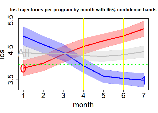 gr1 <- group(x="program", y="los", z="month", dataf=hosprog, dist="t", increment=3, rolling=6)