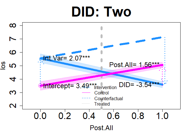 plot(dm1, "DID", add.legend="bottom", xlim=c(-.1, 1.1), ylim=c(2, 8), main="DID: Two", col=c("dodgerblue","magenta"), lwd=7, cex=2, cex.axis=2, cex.lab=1.5, cex.main=3, arrow=TRUE, xshift=c(.02), cex.text=1.5, coefs=TRUE, round.c=2, cfact=T, conf.int=TRUE, adj.alpha=0.2 )