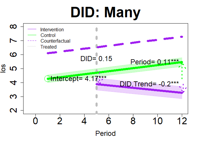 plot(dm2, "DID", add.legend="topleft", xlim=c(-.5, 12), ylim=c(2, 8), main="DID: Many", col=c("purple","green"), lwd=7, cex=3, cex.axis=2, cex.lab=1.5, cex.main=3, arrow=TRUE, xshift=c(.25, .1), cex.text=1.5, coefs=TRUE, round.c=2, cfact=T, conf.int=TRUE, adj.alpha=0.2 )