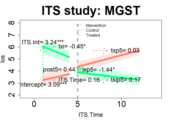 plot(im21, "ITS", add.legend="top", xlim=c(-1, 14), ylim=c(2, 8), main="ITS study: MGST", col=c("springgreen","salmon"), lwd=7, cex=3, cex.axis=2, cex.lab=1.5, cex.main=3, arrow=TRUE, xshift=c(.25, .25), cex.text=1.5, coefs=TRUE, round.c=2, pos.text= list("post5"=2), conf.int=TRUE, adj.alpha=0.2 )