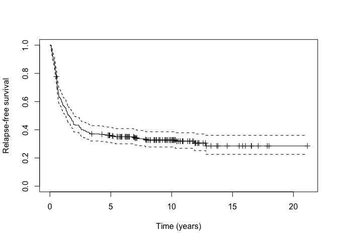km_train <- survfit(Surv(cryr, relapse.death) ~ 1, data = amltrain)