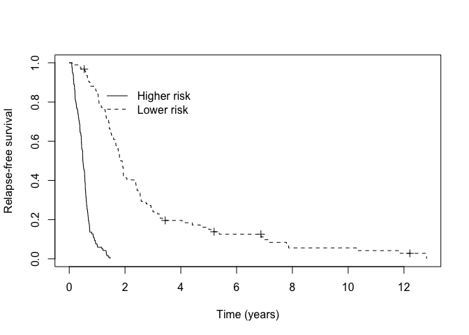 km_suscept <- survfit(Surv(cryr, relapse.death) ~ train_predict$latency_risk, data = amltrain, subset = (p_group == "Susceptible"))