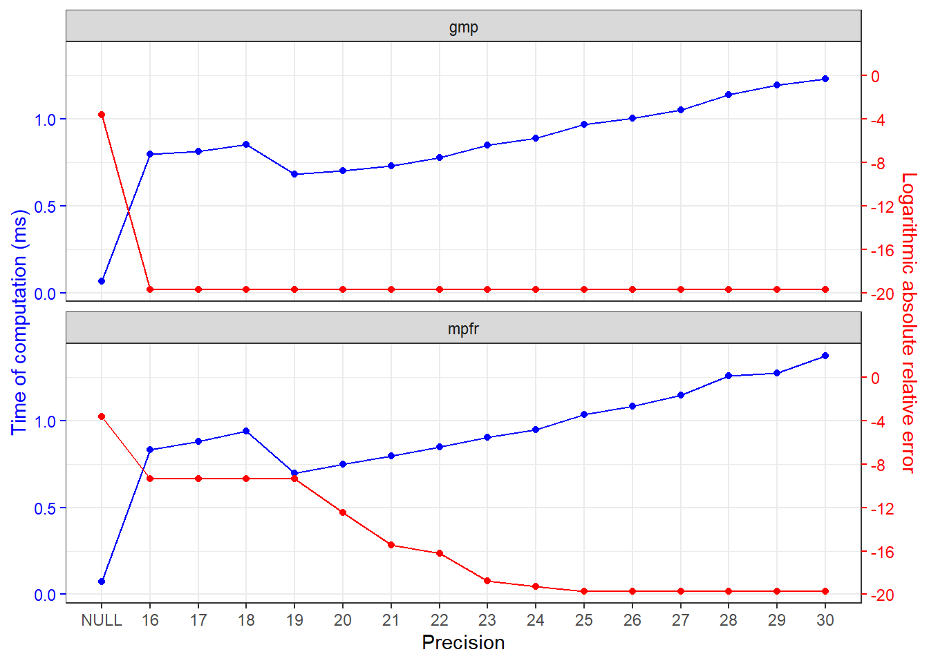 ggplot2::labs(x = "Precision", y = "Time of computation (ms)")
