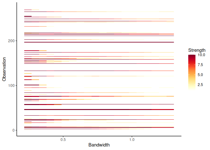 Next we look at outlier persistence. The outlier persistence plot shows the outliers that persist over a range of bandwidth values for different levels of significance. The strength is inversely proportional to the level of significance. If the level of significance is 0.01, then the strength is 10 and if it is 0.1, then the strength is 1.
