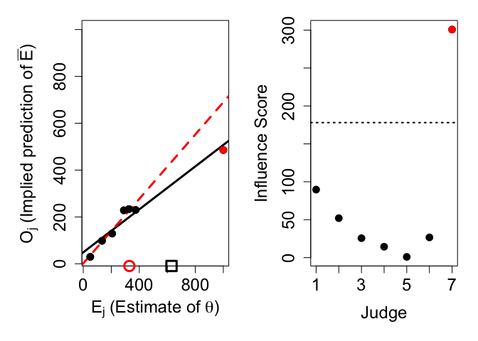 The output prints the influence scores for each judge. Intuitively, an influence score shows how much the knowledge-weighted estimate would change if that judge was removed from the crowd. Our analysis shows that judge 7 is highly influential, with an influence score of around 300. Compare this to the influence scores of judges 1-6. They are all smaller than 90 and hence much smaller than judge 7’s influence score.