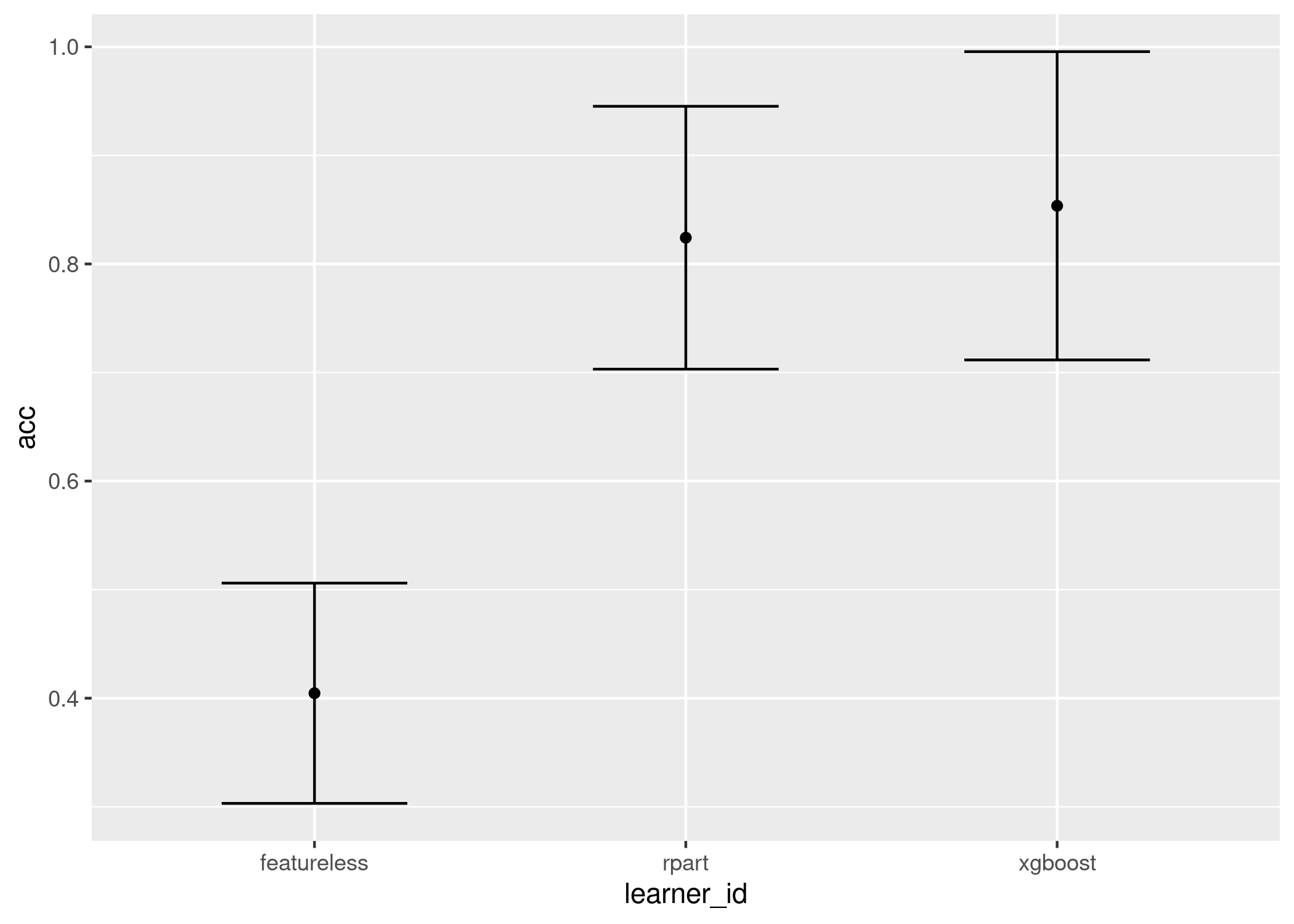 bm = benchmark(benchmark_grid(task, learns, rsmp("cv", folds = 3)))Now we create a BenchmarkAggr object for our analysis,