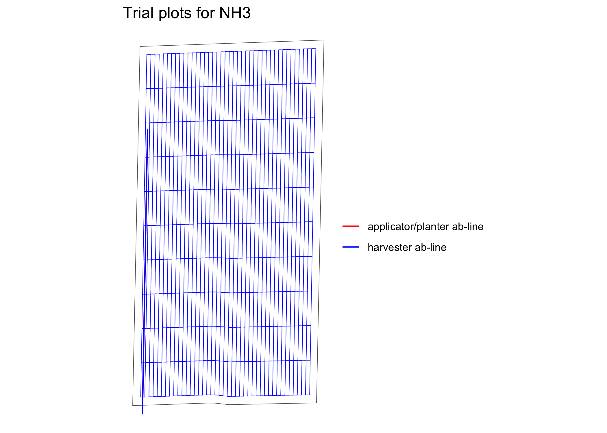 Along with the spatial pattern of the input rates, the applicator/planter ab-line and harvester ab-line are drawn by default.